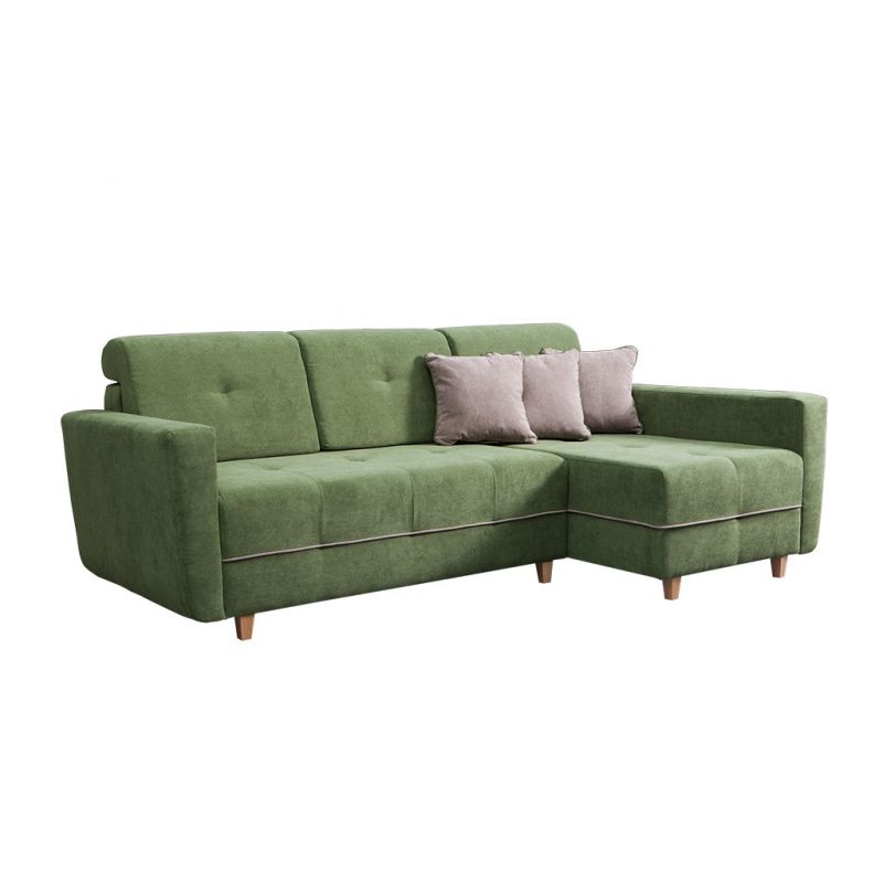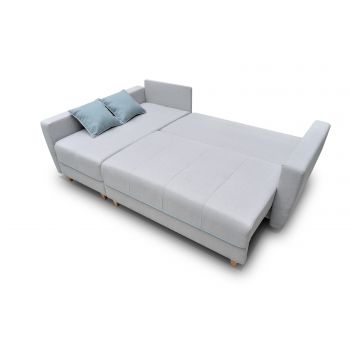 Narożnik z powodzeniem może służyć jako łózko, sprawdzi się również w niewielkich pomieszczeniach. Po złożeniu zapewnia komfortowe miejsce do siedzenia, natomiast po rozłożeniu świetnie sprawdza się jej funkcja spania. Została wykonana NA SPRĘŻYNACH falistych co jest jej dodatkowym atutem, ponad to w kanapie została zastosowana wysoko elastyczna pianka typu HR, dzięki czemu jej użytkowanie jest niezwykle komfortowe. Narożnik posiada proste nóżki w kolorze drewna. Jej dodatkową zaletą jest to, że posiada wygodne podłokietniki. Kanapa posiada tył obity materiałem, przez co może stać w dowolnej części pomieszczenia. produkt wykonany w całości w Polsce. Konstrukcja NAROŻNIKA JEST z litego drewna i płyty laminowanej, zapewnia wytrzymałość i trwałość mebla. Funkcja spania rozkładana za pomocą wygodnego automatu dzięki temu w rozłożenie sofy nie trzeba użyć dużo siły. Pod siedziskiem znajduje się dość spory pojemnik na pościel, który pomoże w utrzymaniu porządku, kiedy rogówka jest złożona.