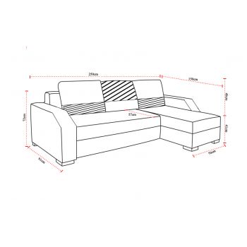 Narożnik LARSO to nietuzinkowy narożnik w kilku możliwych konfiguracjach z tkaniną. Narożnik posiada funkcję spania, która wynosi 195 x 125 centymetrów. Jego wymiary to 250x150x90 centymetrów. Został wykonany z drewna i płyty laminowanej oraz sprężyn typu bonell oraz pianki T25. Dodatkowo narożnik posiada duży pojemnik na pościel i nie tylko. Narożnik jest uniwersalny. Narożnik larso jest to meblem, który spełni wszystkie Twoje oczekiwania. Rogówka larso została wyposażony w dwa pojemne miejsca na pościel - jeden z nich usytuowany w otomanie, otwierany w wygodny sposób za pomocą mechanizmu wspomagającego sprężynowego, drugi dostępny po rozłożeniu do funkcji spania.