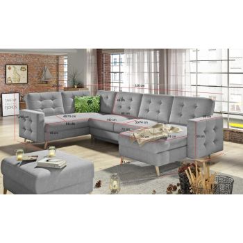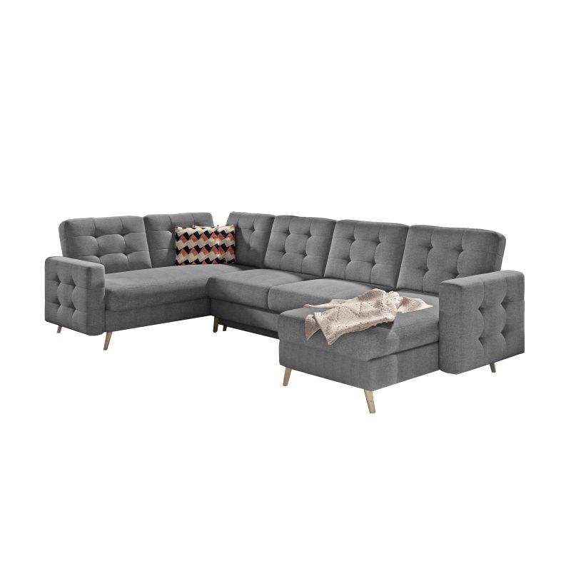 Model IVI U będzie pasował do nowoczesnego stylu urządzania wnętrz, ale sprawdzi się też w aranżacji skandynawskiej. Funkcjonalny narożnik rozłożysz w razie potrzeby i przenocujesz niespodziewanych gości. Wykonany na sprężynie falistej model IVI U  wyróżnia się również wytrzymałością, ponieważ jego konstrukcja jest oparta na drewnie i płycie laminowanej.Na wygląd mebla wpływają gustowne zdobienia w postaci eleganckich pikowań i delikatnych przeszyć umiejscowionych na oparciu i bokach narożnika oraz drewniane, wysokie, toczone nogi.