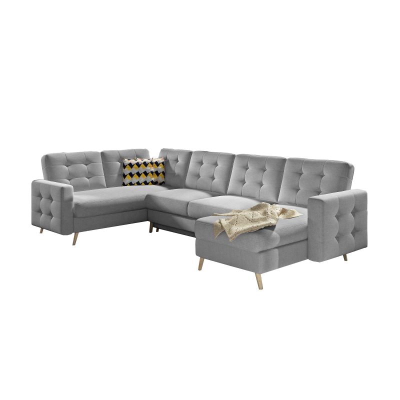 Model IVI U będzie pasował do nowoczesnego stylu urządzania wnętrz, ale sprawdzi się też w aranżacji skandynawskiej. Funkcjonalny narożnik rozłożysz w razie potrzeby i przenocujesz niespodziewanych gości. Wykonany na sprężynie falistej model IVI U  wyróżnia się również wytrzymałością, ponieważ jego konstrukcja jest oparta na drewnie i płycie laminowanej.Na wygląd mebla wpływają gustowne zdobienia w postaci eleganckich pikowań i delikatnych przeszyć umiejscowionych na oparciu i bokach narożnika oraz drewniane, wysokie, toczone nogi.