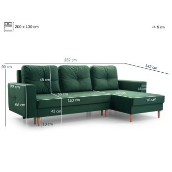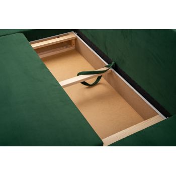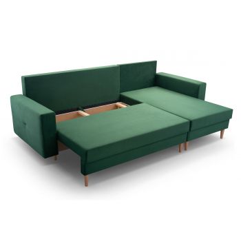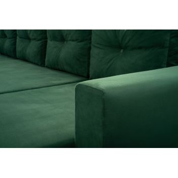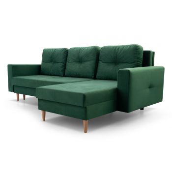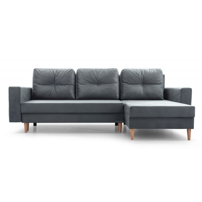 Narożnik Carl zapewni komfort wypoczynku całej rodzinie, jednocześnie doskonale uzupełni aranżację salonu. W siedzisku zastosowano piankę wysokoelastyczną, całość pokryta pluszową tkaniną Manila. Funkcja spania Typu DL to szybki, prosty i wygodny sposób rozkładania. Aby rozłożyć narożnik do funkcji spania wyciągamy siedzisko do przodu i kładziemy oparcie. Pod siedziskiem umieszczony został pojemnik na pościel, dzięki któremu będziemy mogli schować dodatkowe koce czy też poduszki bez zajmowania przestrzeni w szafach. Po rozłożeniu powierzchnia spania wynosi 200x130 cm. W narożniku zastosowano ozdobne, drewniane nóżki, o wysokości 13cm, które dodają lekkości całej bryle. W komplecie narożnika Carl znajdują się 3 duże, dekoracyjne poduszki oparciowe. Dodatkowo elegancji dodają pojedyncze pikowania na poduszkach oraz podłokietnikach. Tapicerowany tył mebla pozwala na ustawienie go w dowolnej przestrzeni pomieszczenia, niekoniecznie pod ścianą.