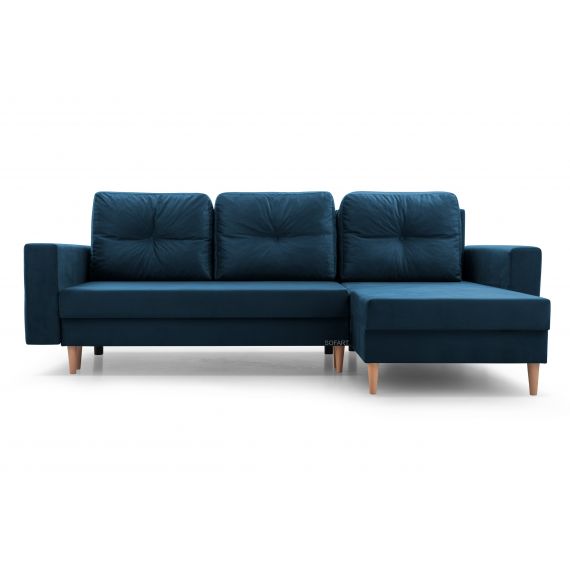 Narożnik Carl zapewni komfort wypoczynku całej rodzinie,  jednocześnie doskonale uzupełni aranżację salonu. W siedzisku zastosowano piankę wysokoelastyczną, całość pokryta pluszową tkaniną Manila. Funkcja spania Typu DL to szybki, prosty i wygodny sposób rozkładania. Aby rozłożyć narożnik do funkcji spania wyciągamy siedzisko do przodu i kładziemy oparcie. Pod siedziskiem umieszczony został pojemnik na pościel, dzięki któremu będziemy mogli schować dodatkowe koce czy też poduszki bez zajmowania przestrzeni w szafach. Po rozłożeniu powierzchnia spania wynosi 200x130 cm. W narożniku zastosowano ozdobne, drewniane nóżki, o wysokości 13cm, które dodają lekkości całej bryle. W komplecie narożnika Carl znajdują się 3 duże, dekoracyjne poduszki oparciowe. Dodatkowo elegancji dodają pojedyncze pikowania na poduszkach oraz podłokietnikach. Tapicerowany tył mebla pozwala na ustawienie go w dowolnej przestrzeni pomieszczenia, niekoniecznie pod ścianą.