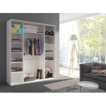 Szukasz gustownej szafy, która nie tylko pomieści Twoje ubrania, ale będzie również dobrze wyglądać? Naszą propozycją takiego produktu jest szafa przesuwna Boss w białym wybarwieniu. Prezentowany przez nas produkt powstał w wymiarach 254x244x62 centymetrów, a wykonano go z płyty laminowanej o dwóch grubościach - 16 milimetrów (fronty) i 22 milimetrów (korpus). Ta szafa znacznie różni się od innych, ponieważ wyposażyliśmy ją aż w troje drzwi przesuwnych z aluminiowymi uchwytami, których system bazuje na aluminiowych prowadnicach i rolkach na łożyskach. Podobnie jak wszystkie nasze produkty, również i w tym przypadku wszelkie krawędzie pokryliśmy obrzeżem ABS. Na trzy wnęki szafy, dwie są identyczne.Uniwersalny kolor doskonale wkomponuje się zarówno we wnętrza w stylu klasycznym, jak i nowoczesnym. Szafa jest wykonana z wysokiej jakości co daje gwarancję komfortowego i bezpiecznego użytkowania przez długie lata. Jest to bardzo przestronny model, który bez problemu pomieści wszystkie Twoje ubrania i dodatki. szafa na drzwiach frontowych wyposażona jest w lustra co optycznie powiększy pomieszczenie.