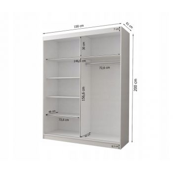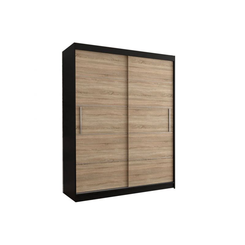 Dwudrzwiowa szafa przesuwna z funkcjonalnym ułożeniem drążka i półek wewnątrz szafy. Szafa jest przeznaczona dla ludzi ceniących wygodę, drzwi przesuwne zapewniają wygodny dostęp do wnętrza szafy i wszystkich Państwa rzeczy. Wnętrze szafy zostało zaprojektowane tak, aby zmieścić jak najwięcej Twoich rzeczy nie zajmując przy tym wiele miejsca. Szafa posiada wygodne uchwyty, które ułatwiają jej otwieranie. Dostępna w kombinacjach kolorów biały, sonoma i czarny. Na drzwiach zostały umieszczone dekoracyjne listewki.